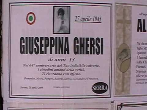 Giuseppina Ghersi (1931 – 30 aprile 1945) era una studentessa di 13 anni dell'istituto magistrale "Maria Giuseppa Rossello" del quartiere “La Villetta” di Savon...a. Una bambina accorta e diligente, figlia di commercianti ortofrutticoli, che abitava in via Tallone, attualmente via Donizetti. Dall’esposto del padre, Giovanni Ghersi, presentato al Procuratore della Repubblica di Savona in data 29 aprile 1949, di cui è possibile chiedere copia all’Archivio di Stato di Savona, e che consta di sei cartelle minuziosamente vergate a mano, leggiamo che: “Il 25 aprile ‘45, alle 5 pomeridiane” i partigiani, appena entrati a Savona, chiedono ai Ghersi del “materiale di medicazione” che la famiglia non esita a “fornire volentieri”. Il giorno successivo, come di consueto, i coniugi si dirigono verso il loro banco di frutta e verdura, ma in zona San Michele, poco dopo le 6.00 del mattino, sono fermati da due partigiani armati di mitra. Vengono portati al Campo di Concentramento di Legino, situato nella zona dell’odierno complesso delle Scuole Medie Guidobono, dove un terzo partigiano sequestra loro le chiavi dell’appartamento e del magazzino. Dopo circa mezz’ora viene deportata al Campo anche la cognata e i partigiani, senza testimoni, possono finalmente procedere rubando le merci dal negozio e tutti i beni della famiglia presenti in casa. Solo Giuseppina manca all’appello perché ospitata da alcuni amici di famiglia in Via Paolo Boselli 6/8.